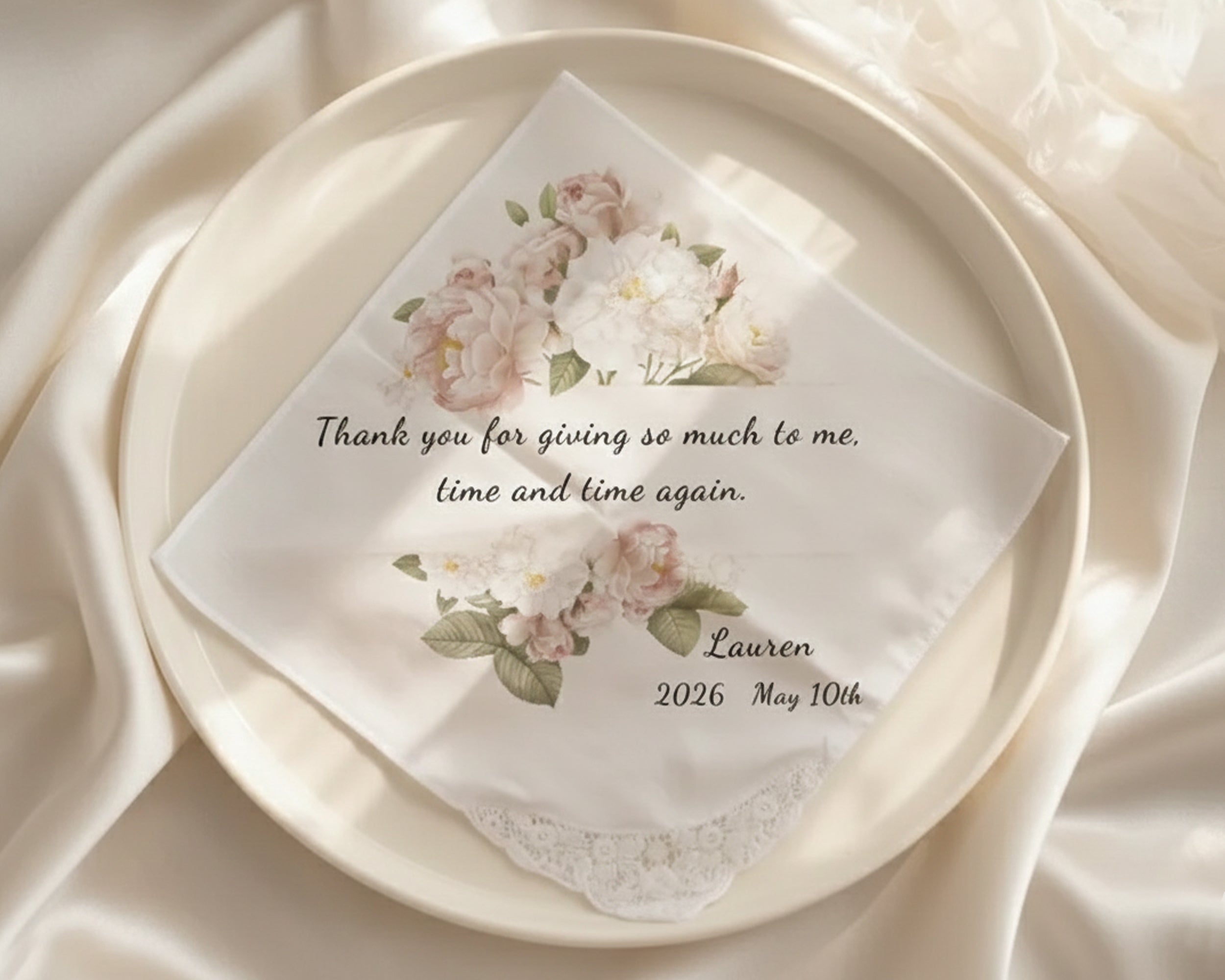Made with premium-quality fabric, these handkerchiefs are thoughtfully designed for both beauty and durability. Each piece is carefully made in the USA, ensuring exceptional craftsmanship and attention to detail. Ideal for weddings, Mother of the Bride or Groom gifts, anniversaries, or milestone celebrations, this personalized handkerchief from The Hankie becomes a treasured reminder she will cherish for years to come.