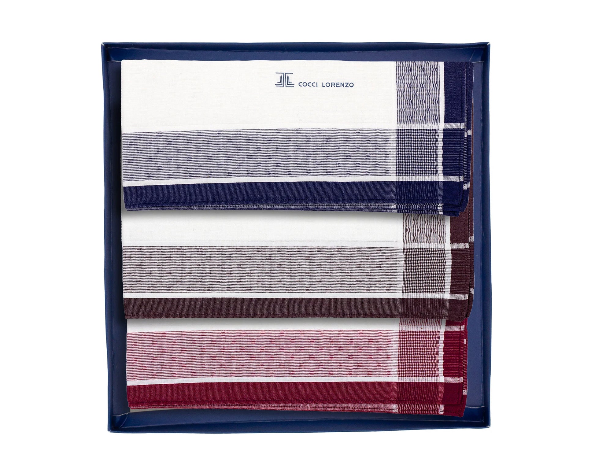 ◎ Gentleman’s Luxe Hanky Set – White Base, Blue Brown & Maroon Edges ◎